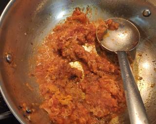 In the same oil, add cumin seeds, asafoetida, green chillies and sauté for them for 1-2 mins. Now add bay leave. Stir. Add tomato paste, sauté till you see oil releasing from the sides. Add ginger paste. Mix it well.