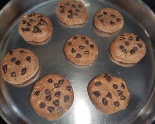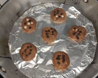 Apply bit of oil or butter on your hands, now with the help of tablespoon, make equal balls from dough, add chocochips on it and gently press them.