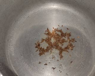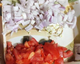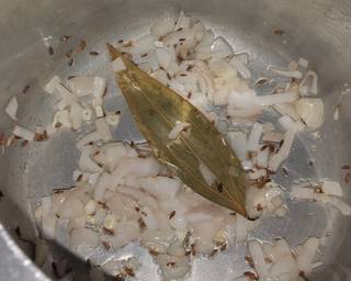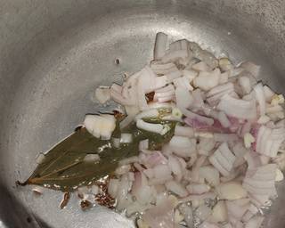 In a pressure cooker, heat some oil on medium low flame. Add cumin seeds, hing, bay leave, chopped onions and garlic. Stir.