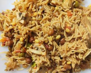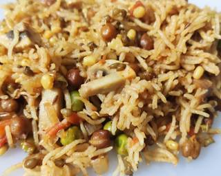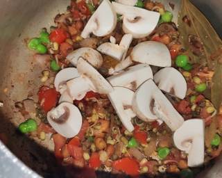 Then add mixed sprouts, green peas, chopped tomatoes, kitchen king masala, garam masala, kashmiri red chilli powder, black pepper powder, coriander powder, dry ginger powder, diced mushrooms, salt and mix.