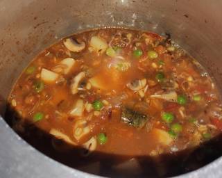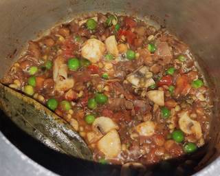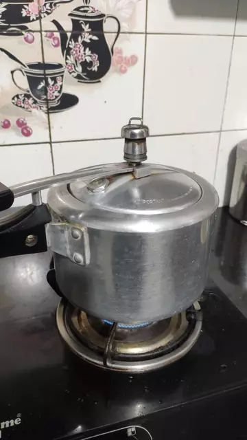 Add soaked rice and mix well. Then add water as required. Stir everything and close the pressure cooker with lid.