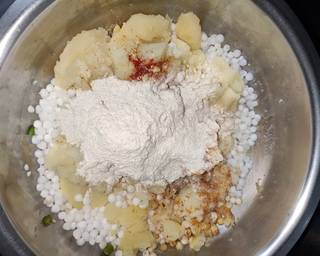 Add mashed potatoes, chopped green chillies, red chilli powder, coriander powder, black pepper powder, dry ginger powder, chopped coriander leaves, grated ginger, rock salt and Kuttu aata.