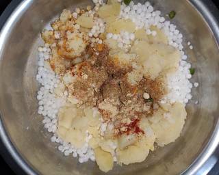 Add 1/2 cup of sabudana in a bowl, rinse them 2-3 times. Drain the water and soak them in one and a half cup of water.. for at least 6 hours. Once they are soaked well, drain the water and transfer the soaked sabudana in a mixing bowl.